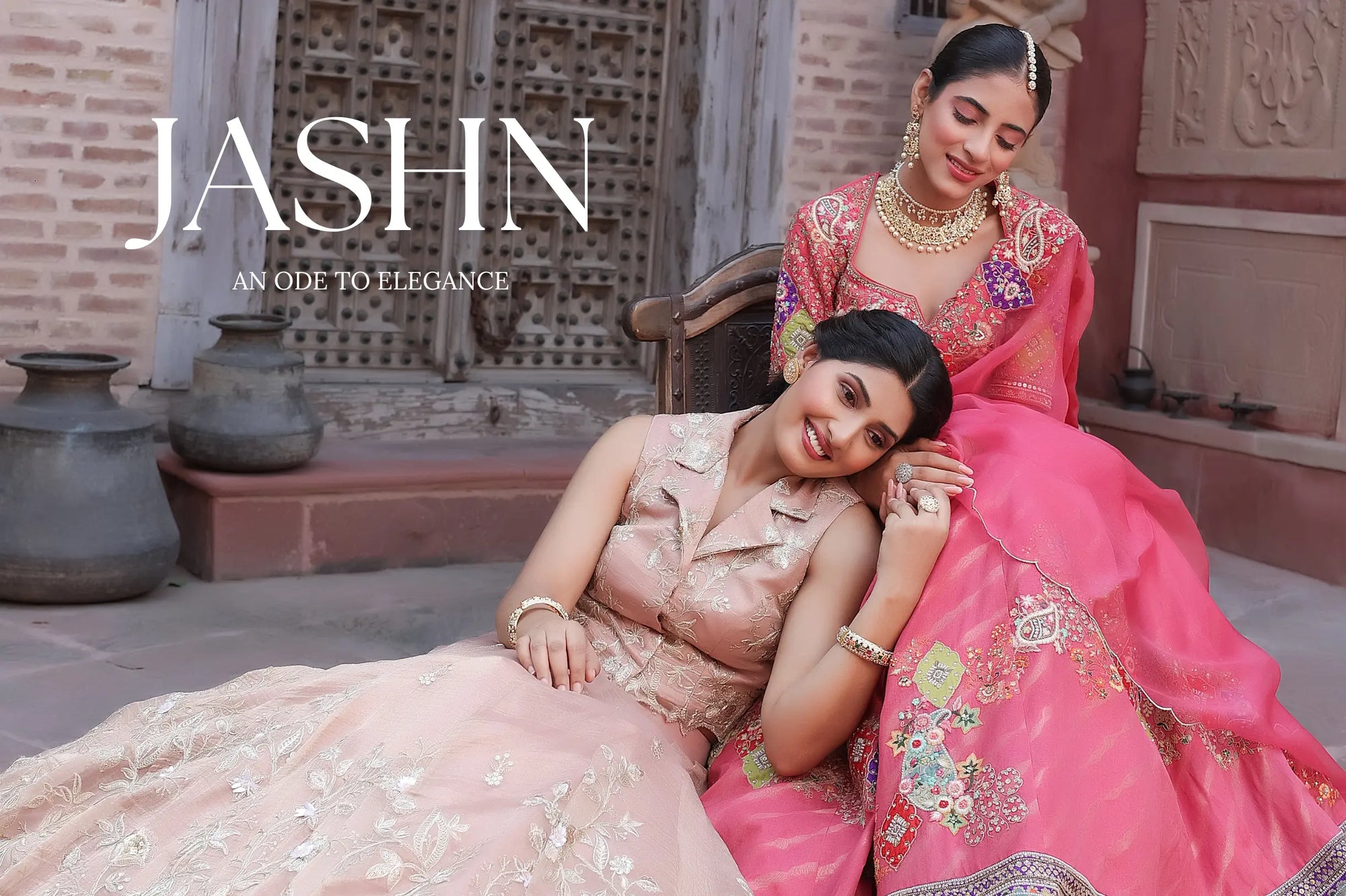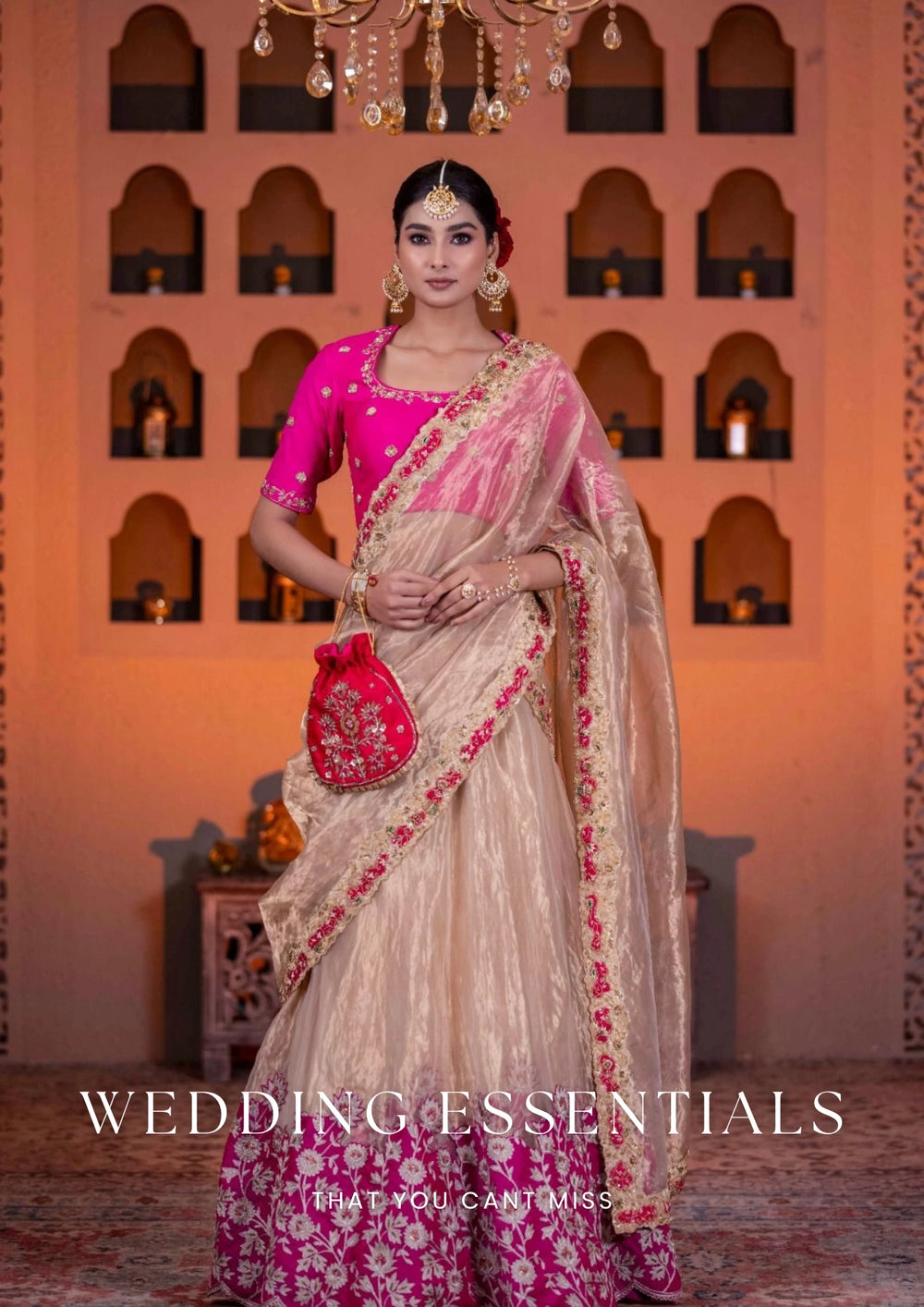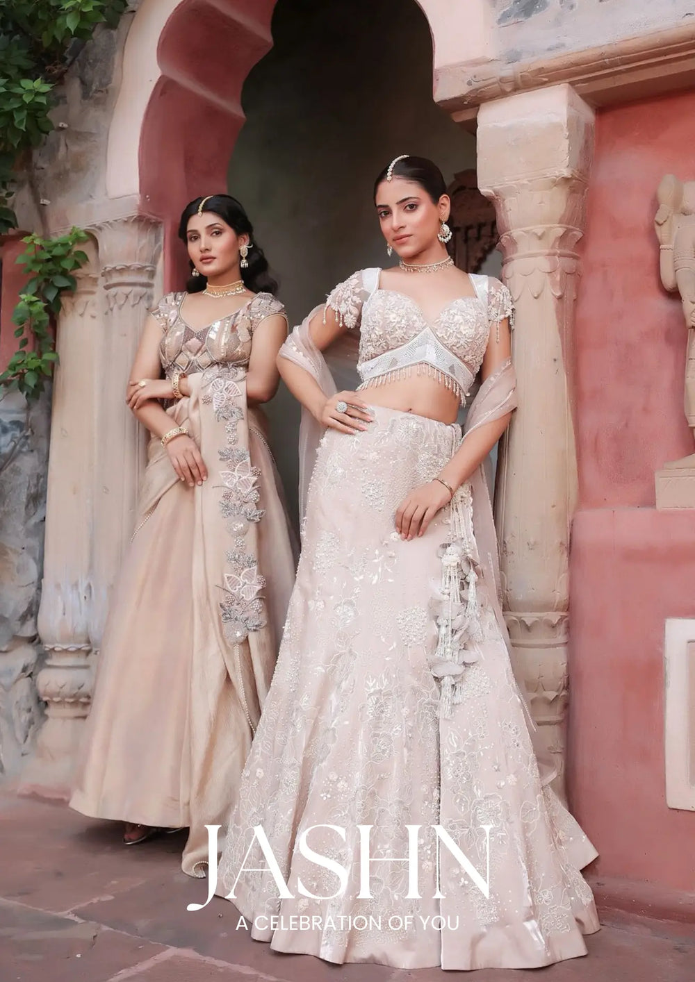 baby pink lehenga set in Jimmy Choo and organza, richly adorned with moti, sequins, cutdana, zari, and dori work.