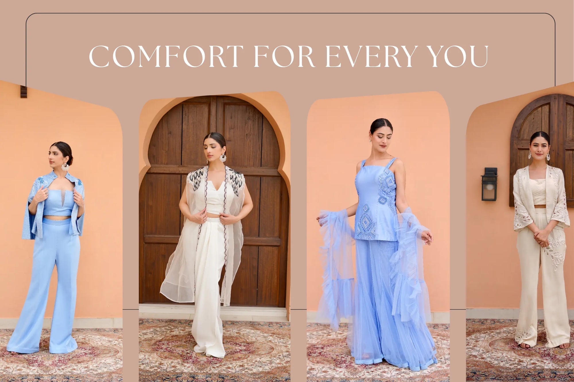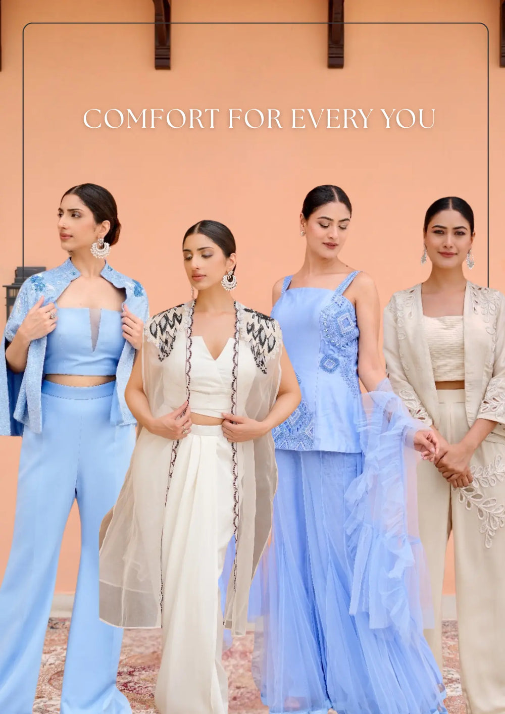 Aqua Party Wear 3 Piece Set with Pearl-Embellished Coat Bustier Top And Dori Palazzo