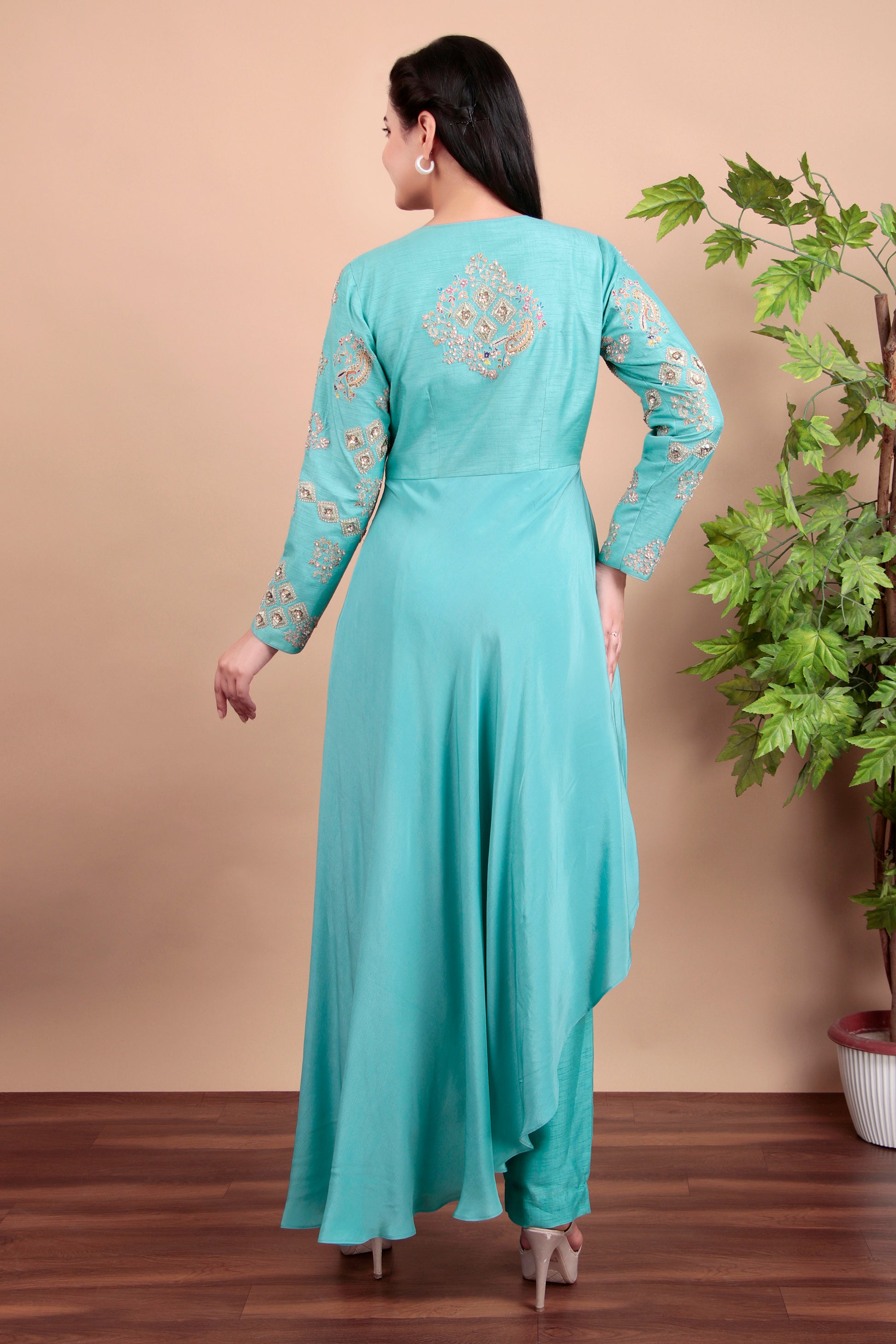 Aqua blue high low anarkali with full sleeve yoke and pant