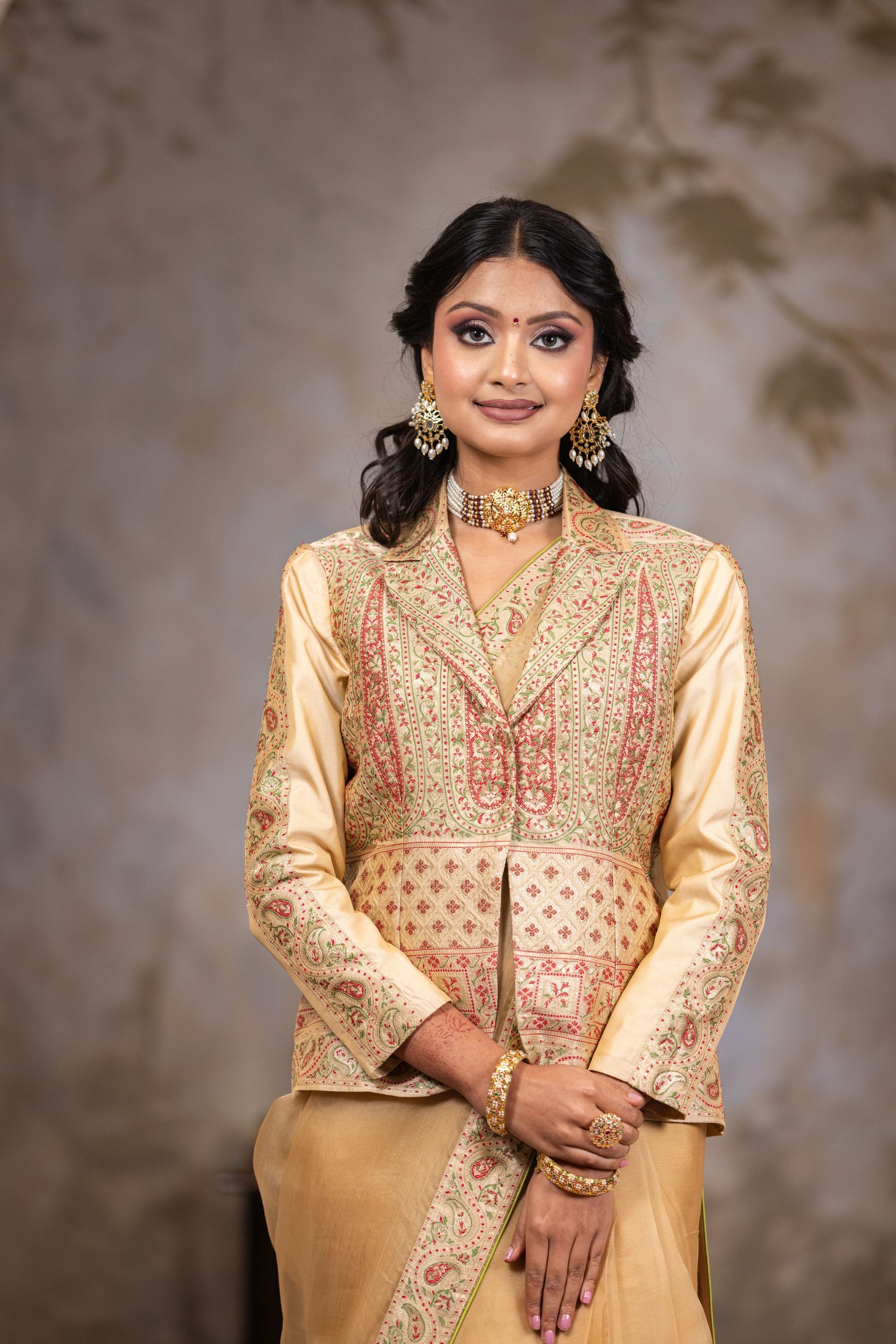 Beige Organza Saree with Beautiful Border and Brocade Jacket