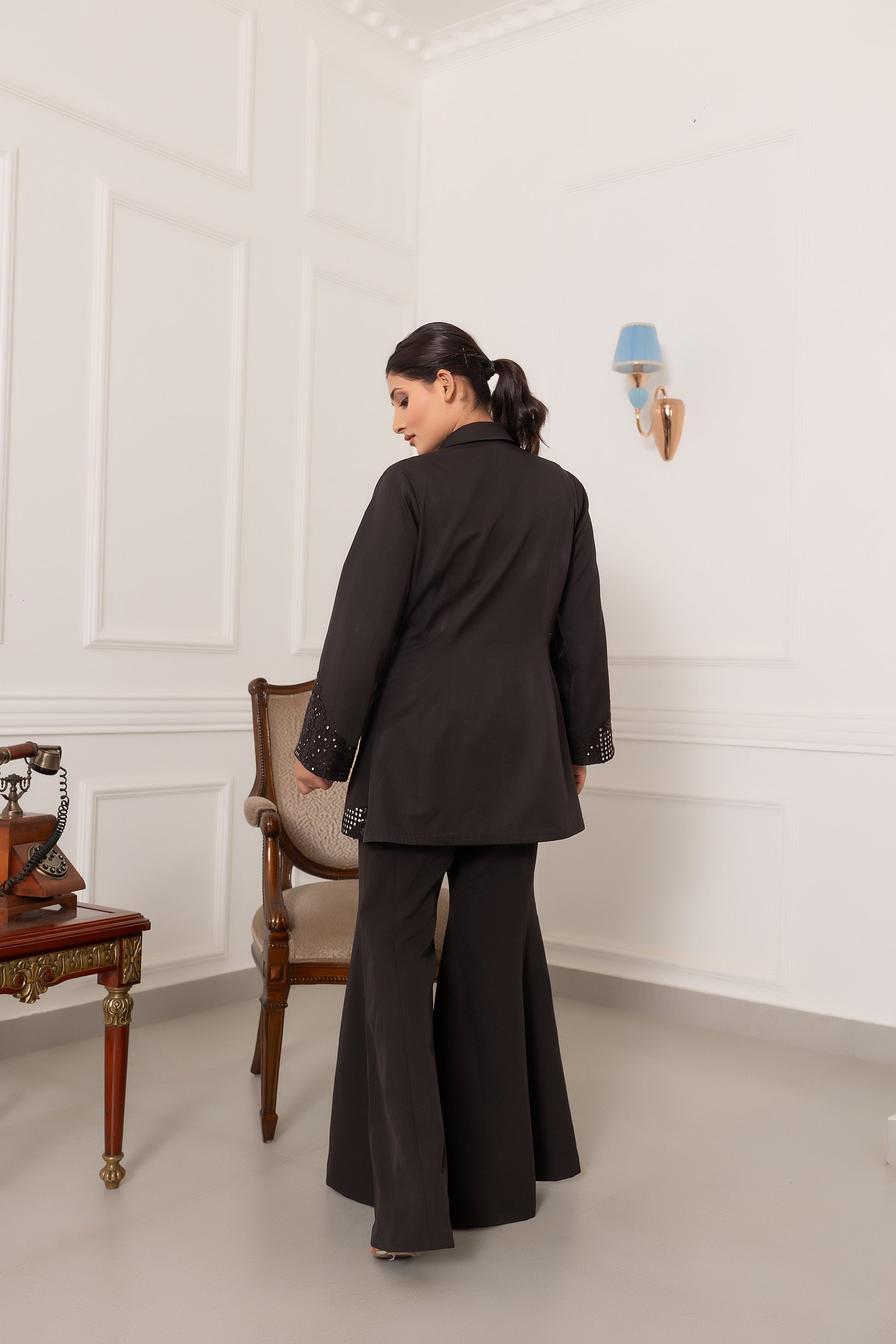 Step into timeless sophistication with this stunning 3-piece Indo-Western set. Designed for effortless elegance, the set features a black coat with intricate thread and sequin-enhanced mirror work that adds just the right amount of sparkle. Paired with a modern, structured bustier and flowy palazzo pants, this ensemble is perfect for formal events, festive occasions, or special celebrations. The breathable fabric ensures comfort while keeping you stylish, and the contemporary cut of the coat balances tradition with a chic edge. Make a bold fashion statement with this versatile and head-turning outfit that radiates confidence and grace.