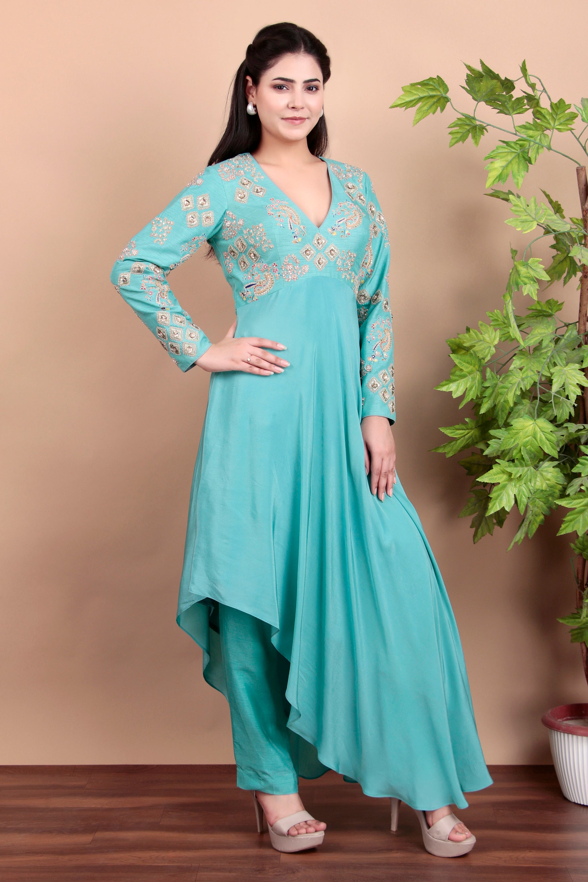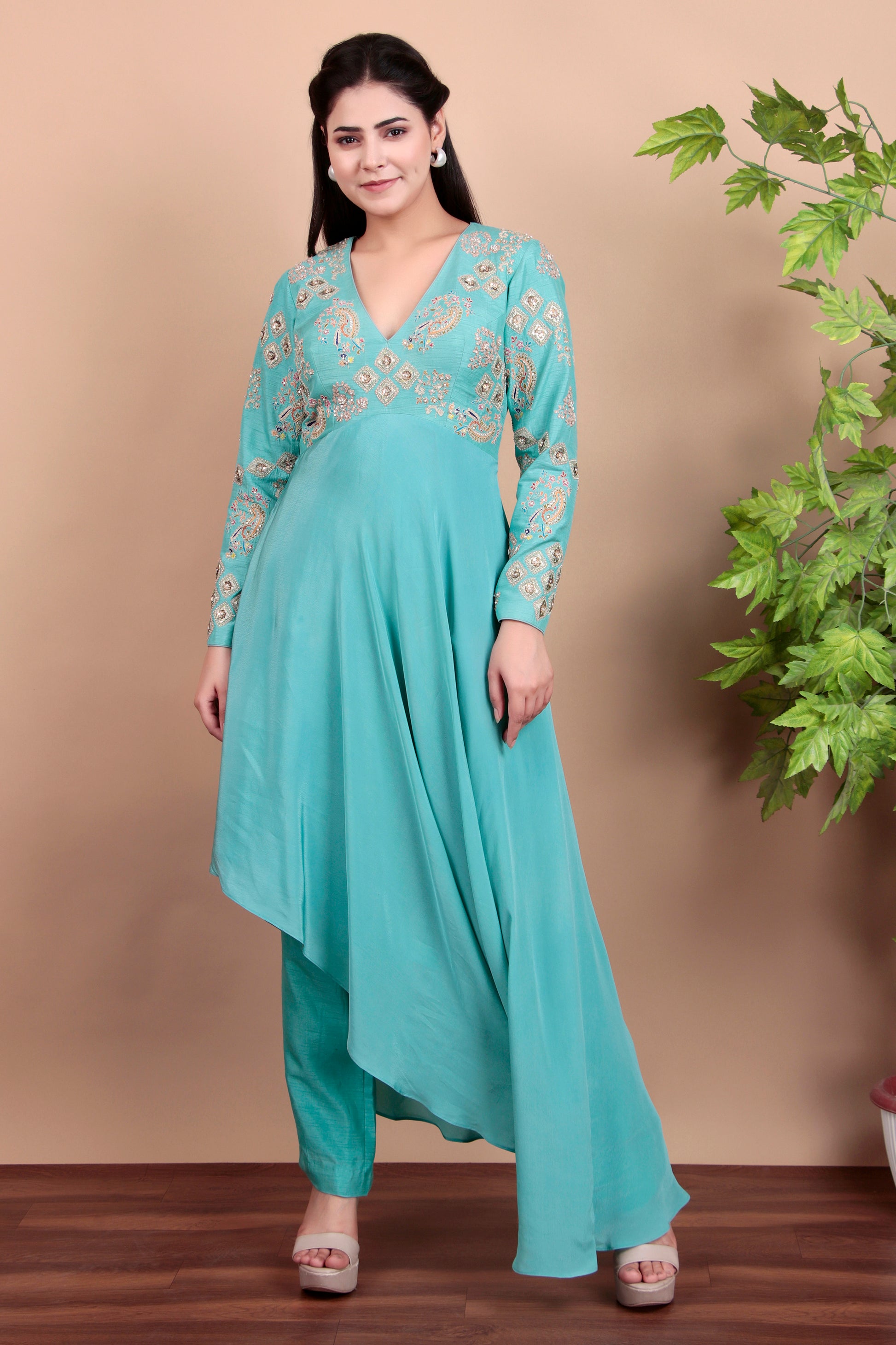 Step into effortless style with this elegant resham-sequin embroidered top and matching tapered pants set. Crafted with attention to detail, the outfit combines delicate embroidery with a flattering silhouette. The lightweight fabric ensures all-day comfort, while the intricate sequin work adds just the right touch of sophistication. Perfect for festive occasions, cocktail parties, or an evening out, this set makes a bold yet refined statement. The tapered pants offer a sleek and modern fit, balancing out the beautifully embellished top. Designed to enhance your natural elegance, this outfit transitions seamlessly from day to night. A must-have addition to your wardrobe!
