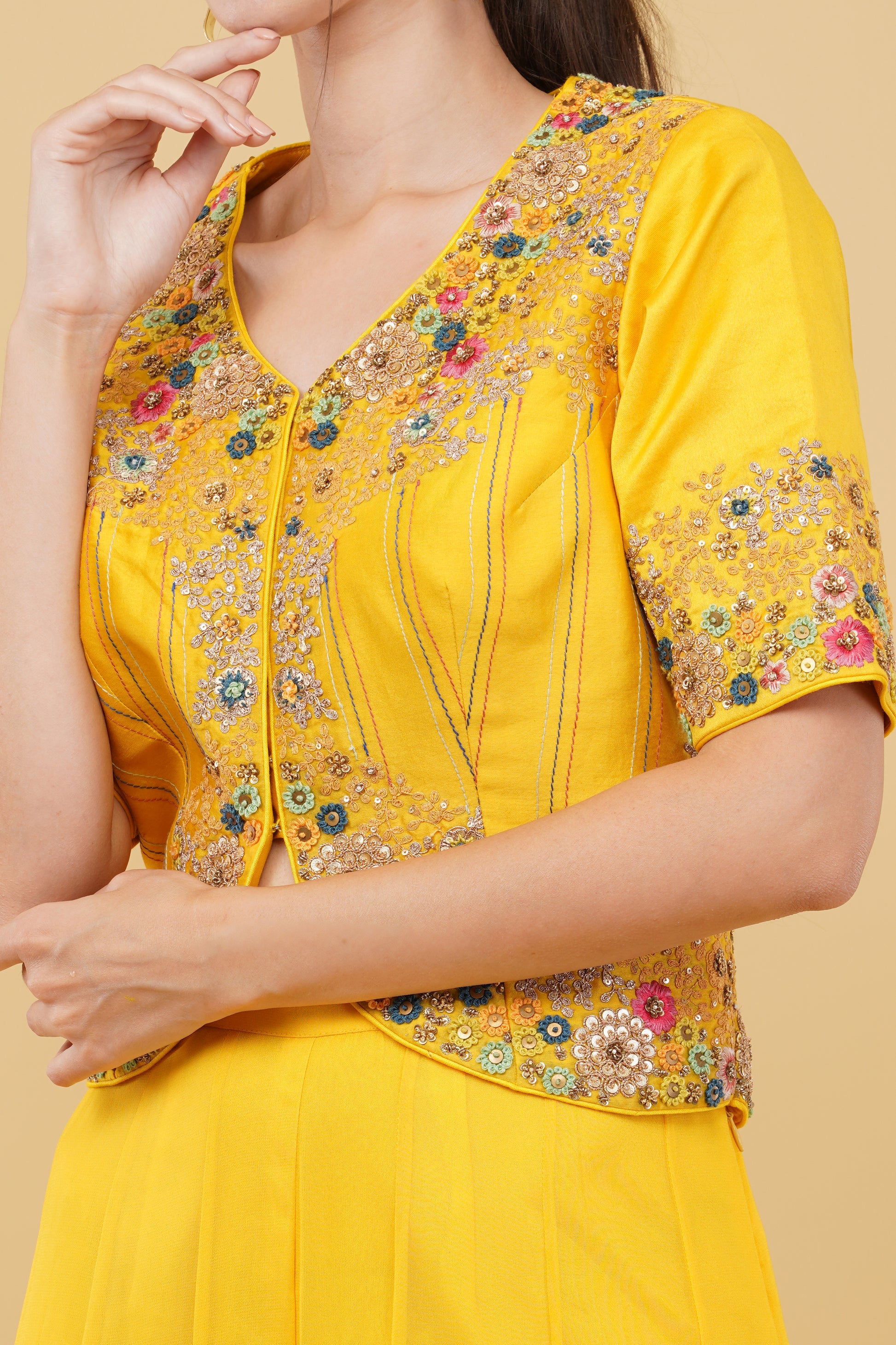Enhance your wardrobe with this elegant yellow georgette palazzo paired with a stylish short jacket. The palazzo’s breezy, lightweight fabric ensures all-day comfort while delivering a sophisticated look. The short jacket is beautifully adorned with intricate metallic accents and dori work, adding an extra touch of flair and elegance. Whether you’re dressing up for a festive occasion, wedding, or casual gathering, this ensemble guarantees timeless appeal. Designed to blend contemporary and traditional aesthetics, this outfit provides effortless grace. Perfect for all body types, it’s as versatile as it is striking.