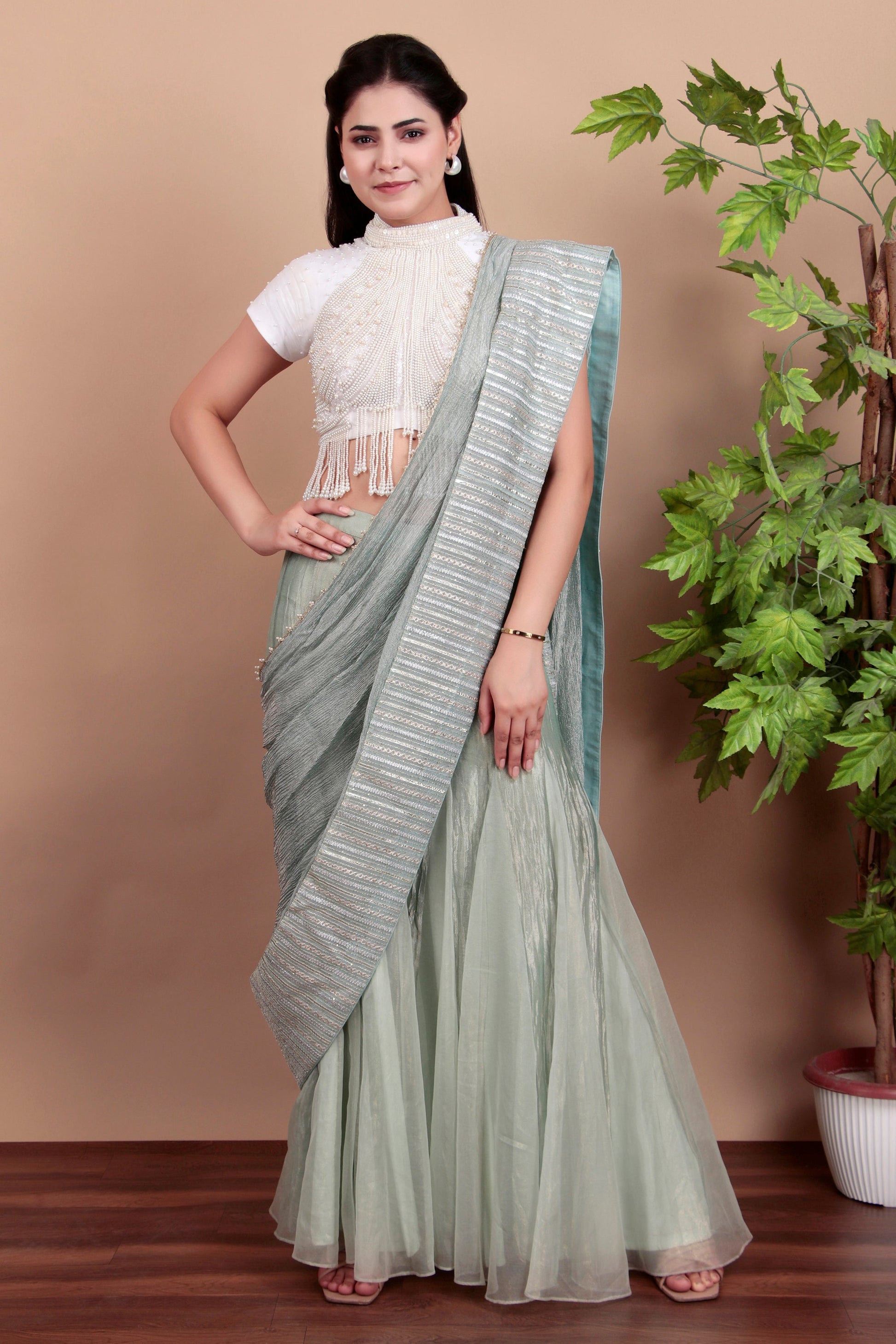 Pastel Green Fusion Plazo Saree with Hand-Embroidered Pallu and Bead-Work Blouse
