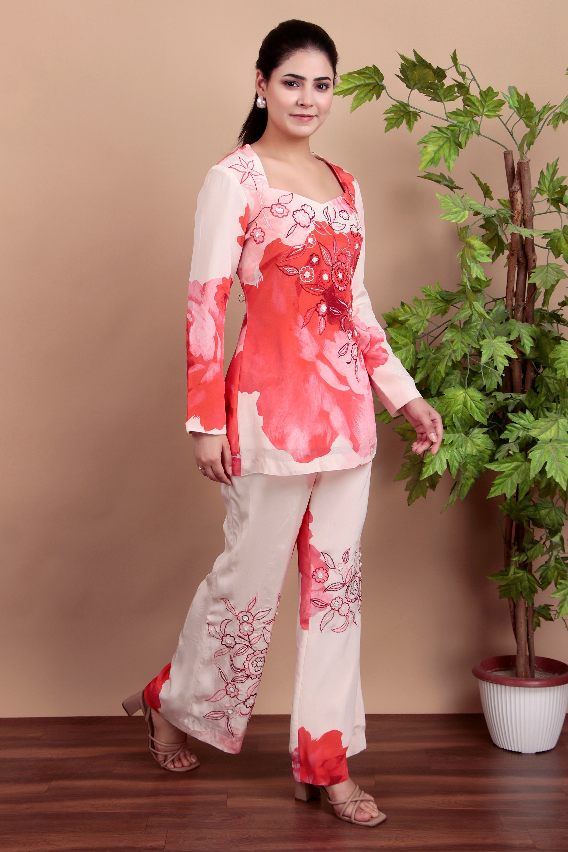 Step out in elegance with this stunning pink floral co-ord set. Perfectly designed for casual outings or festive gatherings, the set features exquisite thread and pearl embroidery that adds a touch of sophistication to your wardrobe. The lightweight fabric ensures comfort throughout the day, while the intricate detailing enhances its charm. The versatile design lets you wear it as a set or mix and match for a fresh look every time. Whether it's a brunch date or a family get-together, this co-ord set will keep you stylish and comfortable. Elevate your style with timeless grace!