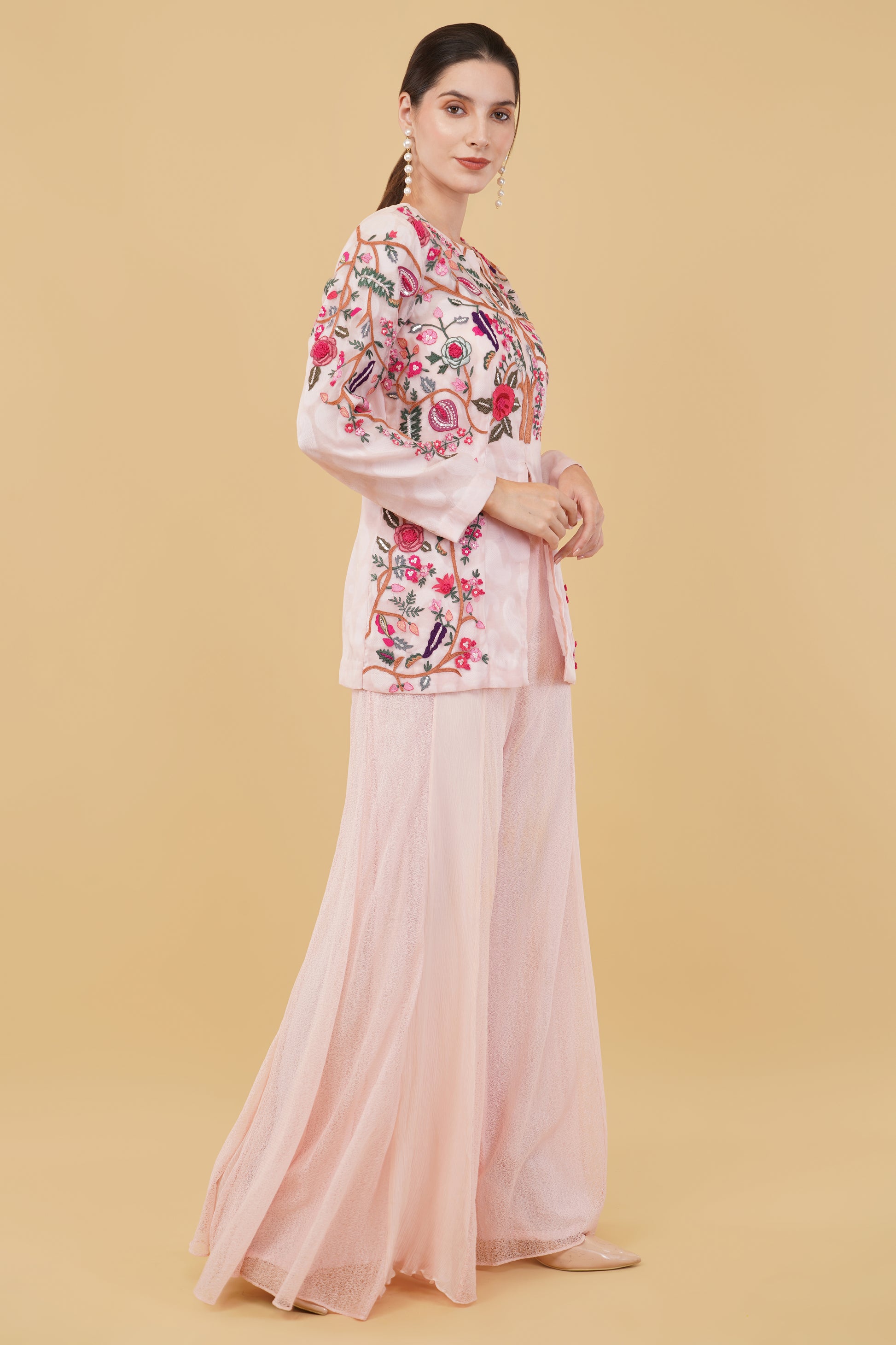 Add an elegant and unique piece to your wardrobe with this pink self-chanderi kurti. Designed with intricate colorful thread work, this kurti showcases sophistication and style. Paired with a beautifully crafted sequin-cutdana jacket, it enhances the outfit’s luxurious feel, while the lightweight mesh palazzo provides both comfort and grace. Perfect for festive events, special occasions, or family gatherings, this set blends tradition with modernity seamlessly.