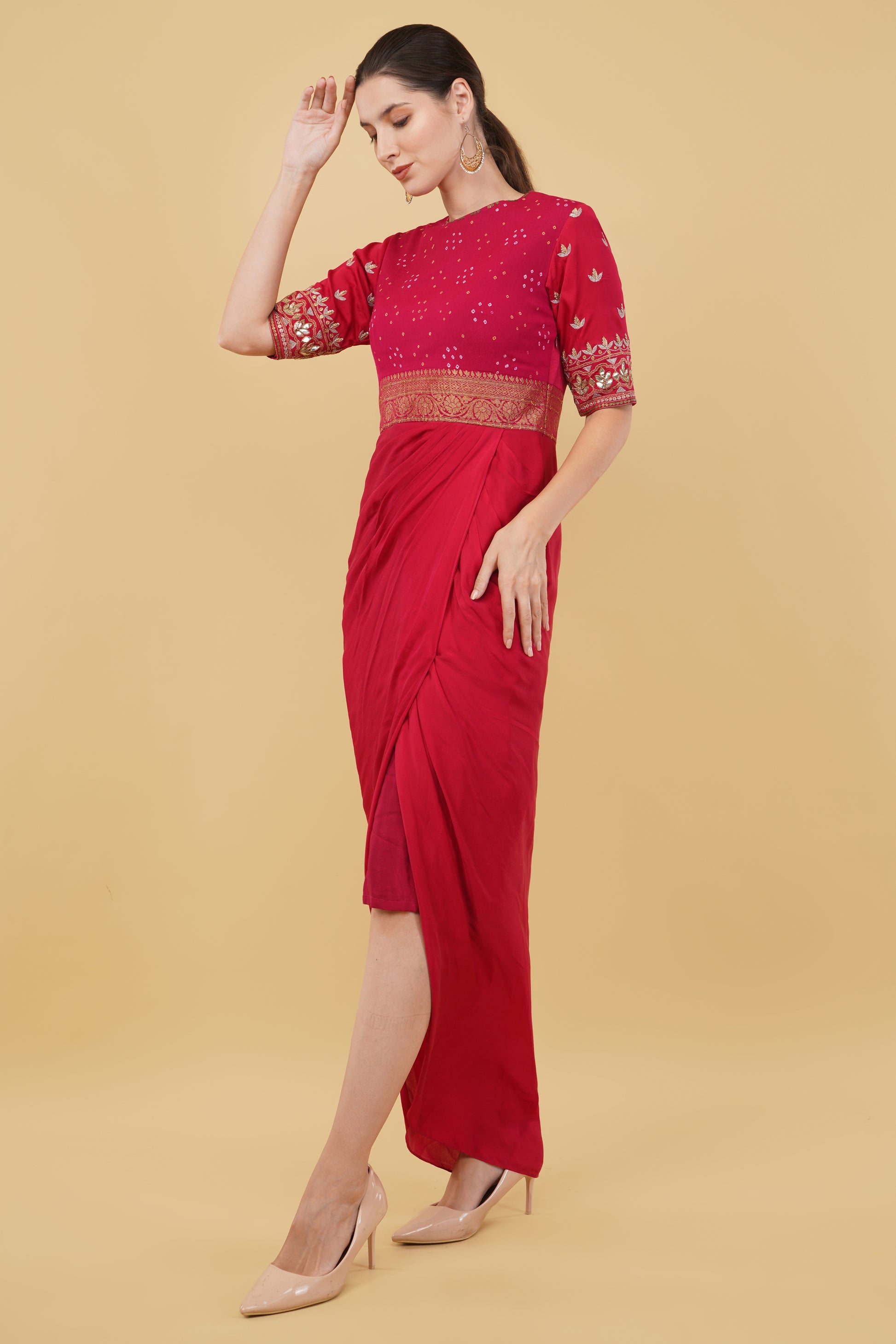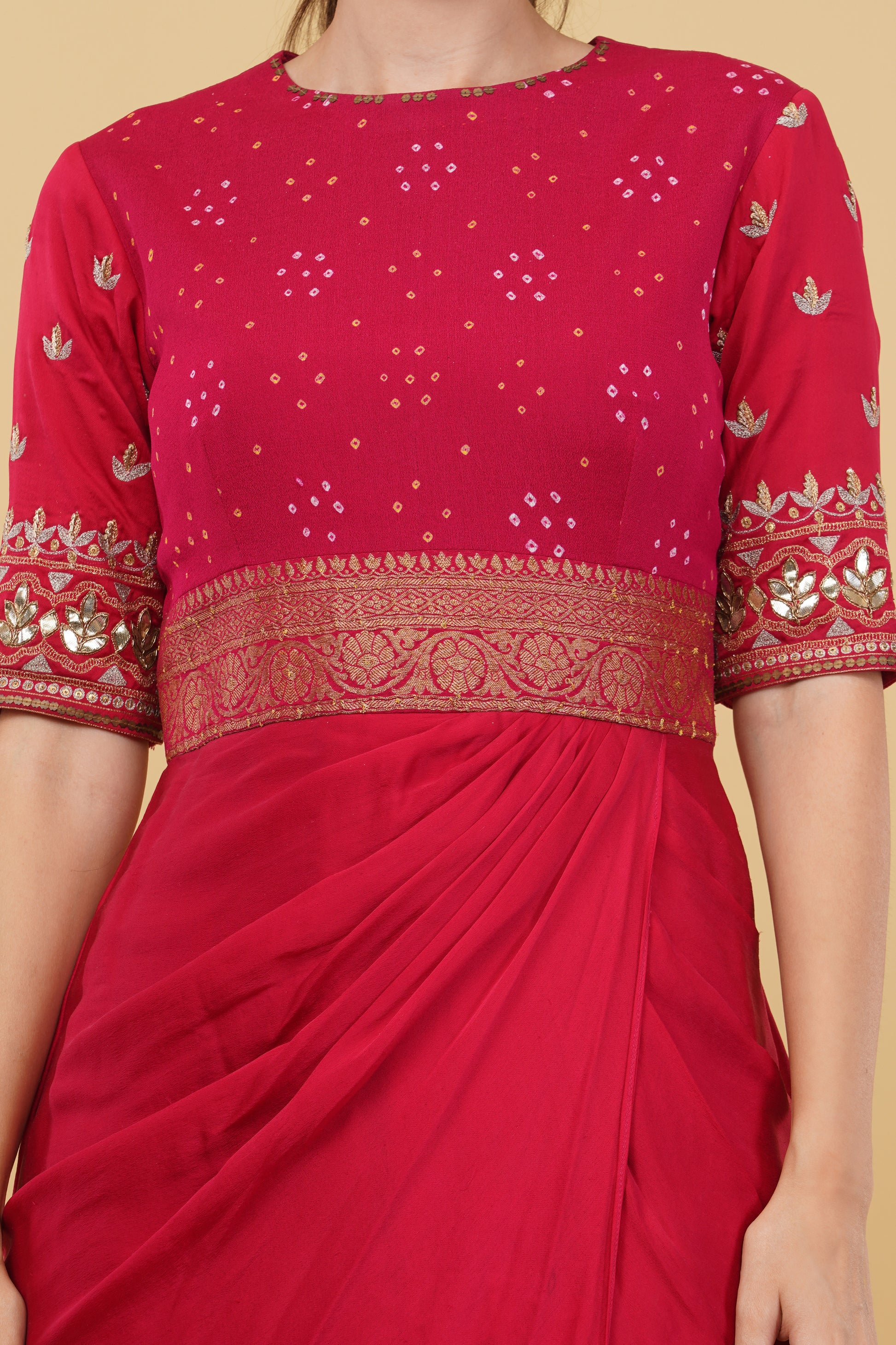 Stand out in the crowd with this stunning red drape dress! Designed with a traditional bandhej pattern on the yoke and sleeves, it adds a beautiful ethnic charm. The delicate gotta patti work enhances the overall look, offering an elegant touch of sparkle for any festive occasion. This dress is perfect for weddings, family gatherings, or cultural celebrations. Made with care to combine comfort and style, it drapes gracefully, giving you a chic silhouette. Pair it with traditional jewelry to complete the outfit and leave a lasting impression.