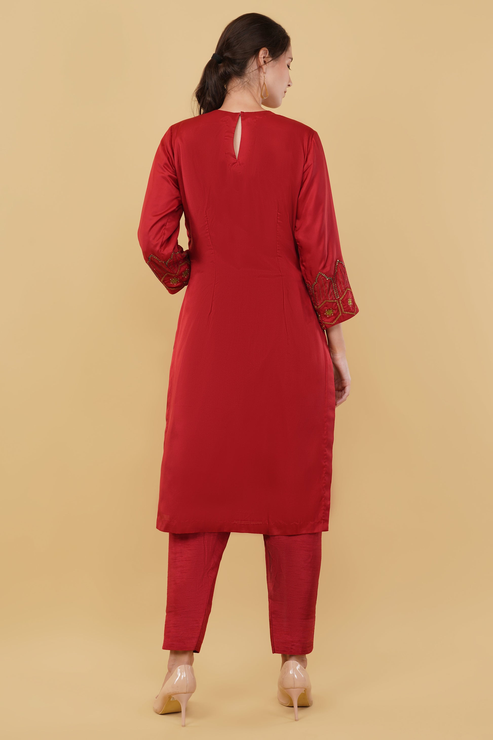Red Suit Set with Heavy Metal Coin Work on Neckline and Sleeves