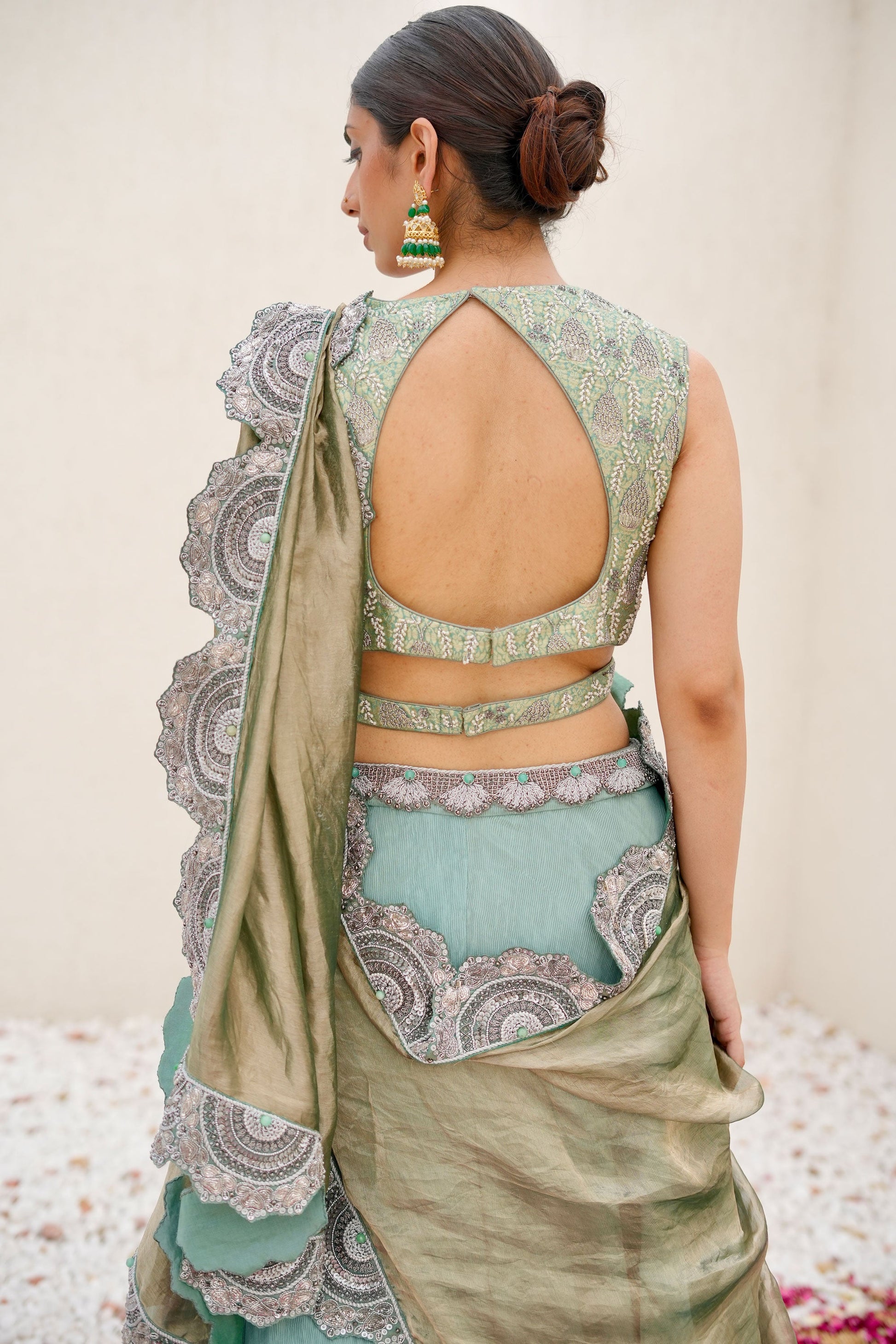Sea Green Hand-Embroidered Wrinkle Lehenga Paired with Brocade Blouse and Cutwork Border Dupatta