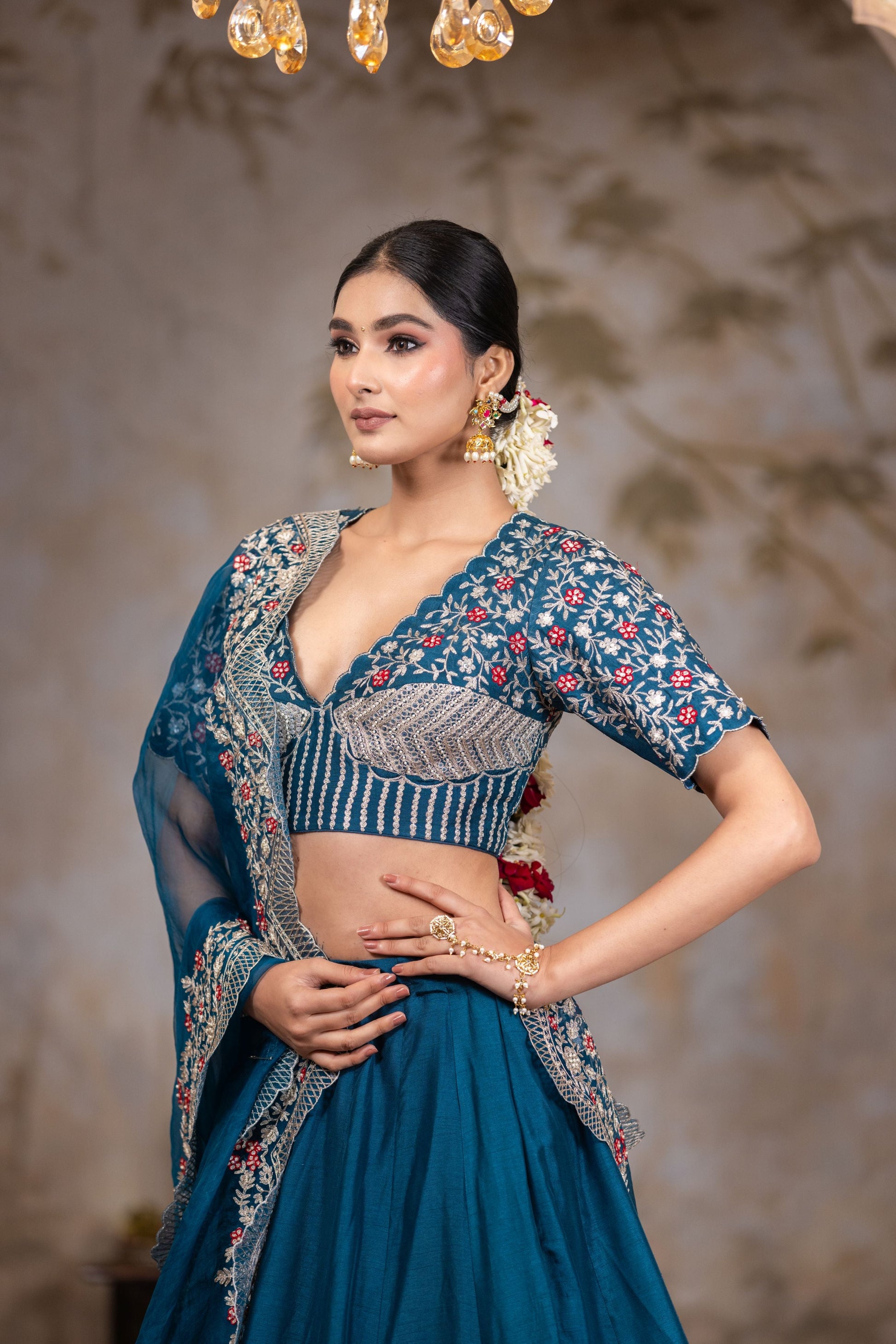 Teal Blue Peacock Lehenga with Heavy Zari Blouse and Organza Dupatta