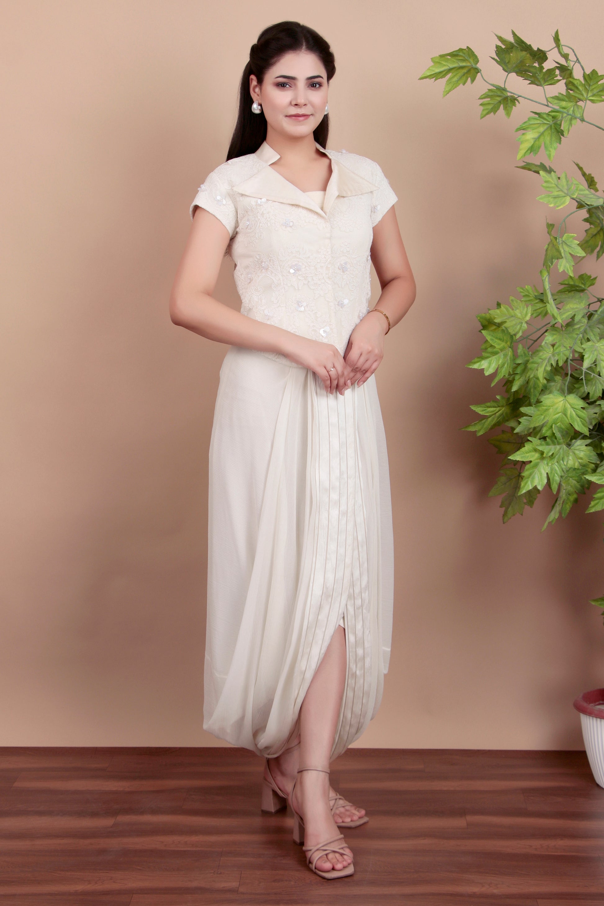 Step into grace with this elegant white indo-western set, a harmonious blend of contemporary style and traditional charm. Featuring an intricately embroidered jacket adorned with shimmering sequins and pearls, this ensemble radiates timeless sophistication. The accompanying draped skirt adds flow and structure, perfect for creating an effortlessly chic silhouette. Ideal for weddings, festive occasions, or upscale gatherings, this set is designed for those who appreciate detailed craftsmanship and superior style. Pair with delicate accessories and minimal heels to let the outfit take center stage. Elevate your wardrobe with this must-have ensemble!